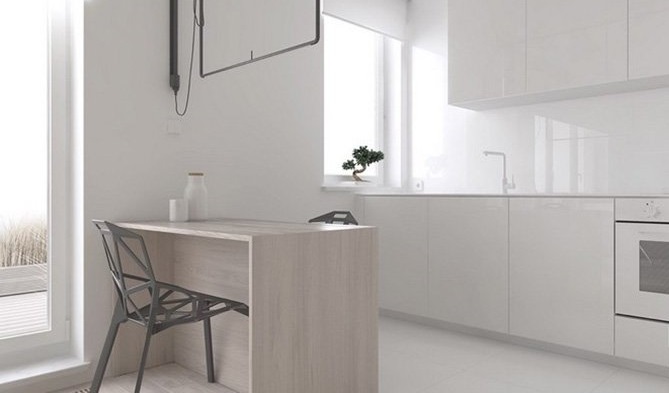 شکل آشپزخانه نیز بسیار زیبا و حرفهای طراحی شده است. آشپزخانه بصورت خطی بوده و یک میز اپن کوچک چوبی در آشپزخانه قرار گرفته است. این میز نقش اپن یا جزیره آشپزخانه و میز غذاخوری را ایفا میکند. بالای میز یک لامپ مدرن متحرک نیز نصب شده که میتوان در صورت نیاز جای لامپ را تغییر داد. رنگ آشپزخانه یکدست سفید است. کابینتها بدون دستگیره و با طرح هایگلاس طراحی شدهاند.
