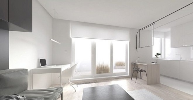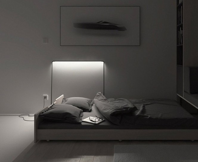 نکته جالب توجه در چیدمان منزل با متراژ کم استفاده از مبل تختخوابشو است. در این آپارتمان یک تخت خواب سایز متوسط دقیقا زیر مبل راحتی قرار گرفته است. تخت خواب به صورت کشویی از قسمت زیرین مبل بیرون کشیده میشود. برای چراغ خواب از لامپ مدرن متحرک آَشپزخانه استفاده میشود. این لامپ طوری طراحی شده که میتوان آنرا از سقف بیرون کشید و به هر جایی از خانه منتقل کرد.