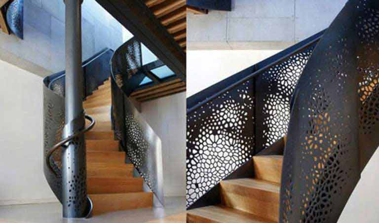 ۳- از دیگر موادی که برای کاتاوت نرده راه پله استفاده می شود، ورقه های فلزی است که طرح های بسیار زیبایی روی آن ایجاد می شود.