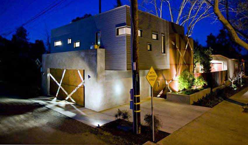 طرح خطی زیبایی که روی در این گاراژ ایجاد شده است نمایی جالب به آن بخشیده است. این منافذ خطی به خوبی نور را به بیرون هدایت می کنند و هنگام شب زیبایی خوبی دارد.