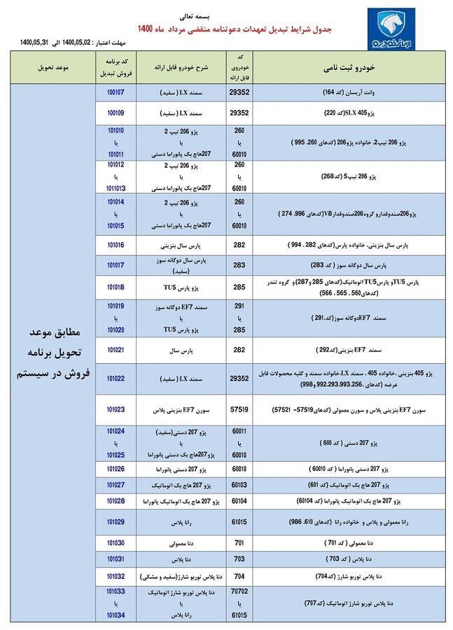 شرایط تبدیل متمرکز مختص تعهدات منقضی، مطابق جـدول پیوسـت اعلام می شود؛ لازم است نمایندگان ایران خودرو در خصوص اطلاع رسانی بـه مشـتریان تعهـدات منقضـی اقـدام لازم را مبذول فرمایند