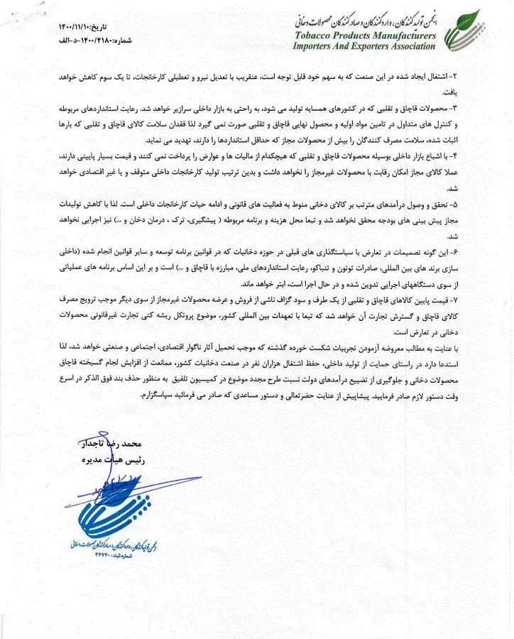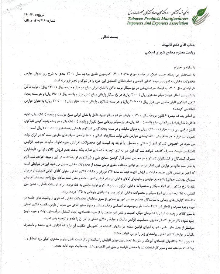انجمن تولیدکنندگان، واردکنندگان و صادرکنندگان محصولات دخانی با ارسال نامهای به محمد باقر قالیباف، رئیس مجلس شورای اسلامی اعلام کردند که «متأسفانه گزارشهای ارسالی به نمایندگان مجلس شورای اسلامی از سوی مخالفان محصولات دخانی که عاری از واقعیتهای جامعه در مورد وجود مصرف و قاچاق این کالا است، با طرح موضوعات احساسی و فاقد مستند و منبع معتبر تلاش مینماید از طریق مقایسه کالای دخانی یا سایر کالاها و وضعیت ایران با کشورهای دیگر، اهمیت و نقش این صنعت را از حیث اقتصادی، ایجاد اشتغال، درآمدهای دولت و غیره ناچیز جلوه نموده تا از طریق کتمان حقایق، حساسیت افزایش مالیات و عوارض کالای دخانی و آثار آن را عادی و توجیه پذیر نماید.»