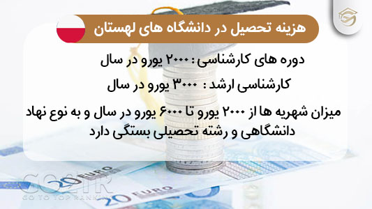 هزینه تحصیل در لهستان پایین است و و معمولاً کمتر از ۴۵۰۰ دلار در سال اعلام شده است. متوسط هزینه زندگی دانشجویی در این کشور ۳۵۰ یورو الی ۵۵۰ یورو برای هر ماه اعلام شده است.