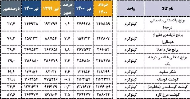 همچنین قیمت هر کیلوگرم برنج طارم اعلا تیر ۱۴۰۰ نسبت به تیر ۱۳۹۹، ۳۹.۴ درصد افزایش داشته و از ۲۶ هزار و ۳۶۵ تومان به ۳۶ هزار و ۷۵۴ تومان رسیده است.
